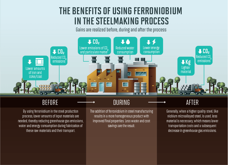 When employed in the steel industry, in addition to enabling enhanced steel properties, niobium can help mills reduce their greenhouse gas emissions, water and energy consumption during the steelmaking process.
