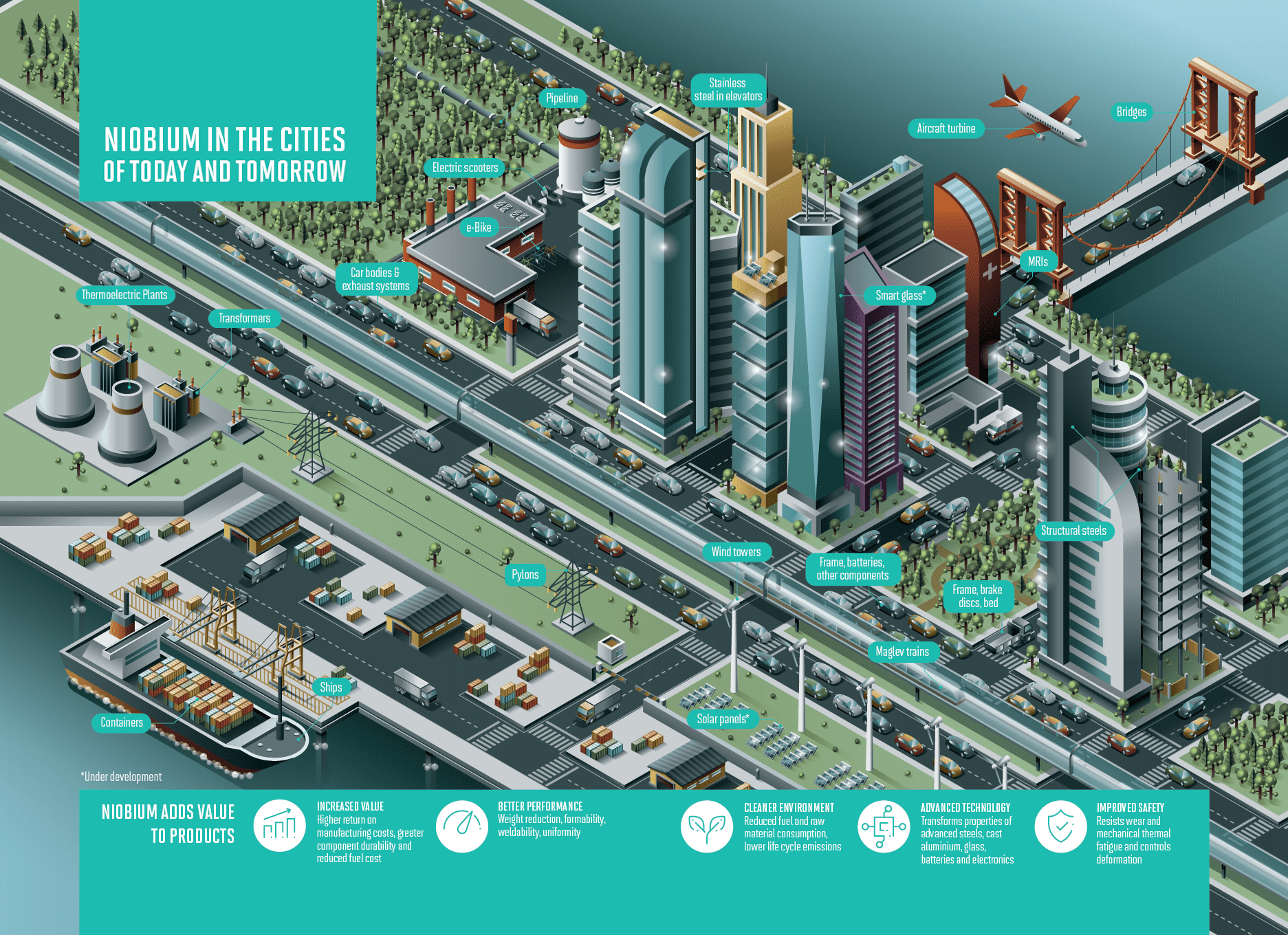 The value proposition of niobium is to transform the properties of materials. It is recognized and applied at scale in sectors like mobility, infrastructure and in the distribution of transitional and renewable energy.